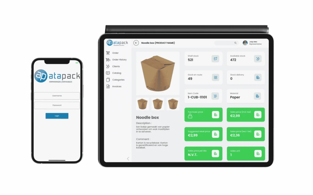 Deze meertalige sales applicatie is op maat gemaakt voor Atapack. Vertegenwoordigers hebben een overzicht van onder andere alle producten, de voorraad, levertijd, prijs en meer. Zij kunnen een order, offerte of nieuwe klant aanmaken die direct in een extern ordersysteem komt te staan.
