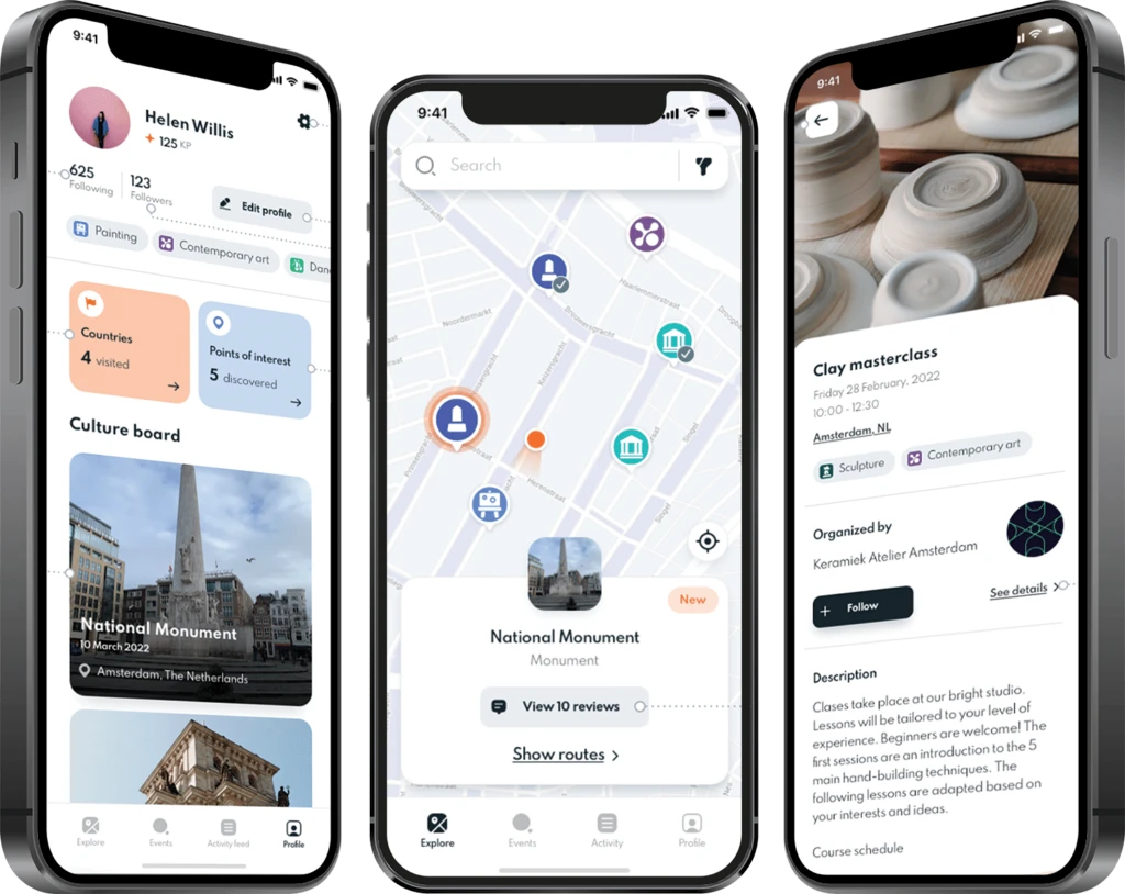 Culture is een mobiele app waarmee je de Nederlandse cultuur kunt verkennen. Met deze app ontdek je van alles, van concerten, Rijksmusea en monumenten tot verborgen pleintjes en stadsbeelden. Zodra je een bezienswaardigheid bereikt, ontvang je relevante informatie over die locatie en kom je te weten wat deze plek te bieden heeft. Op deze manier spaar je tokens die je binnen de app kunt gebruiken.
